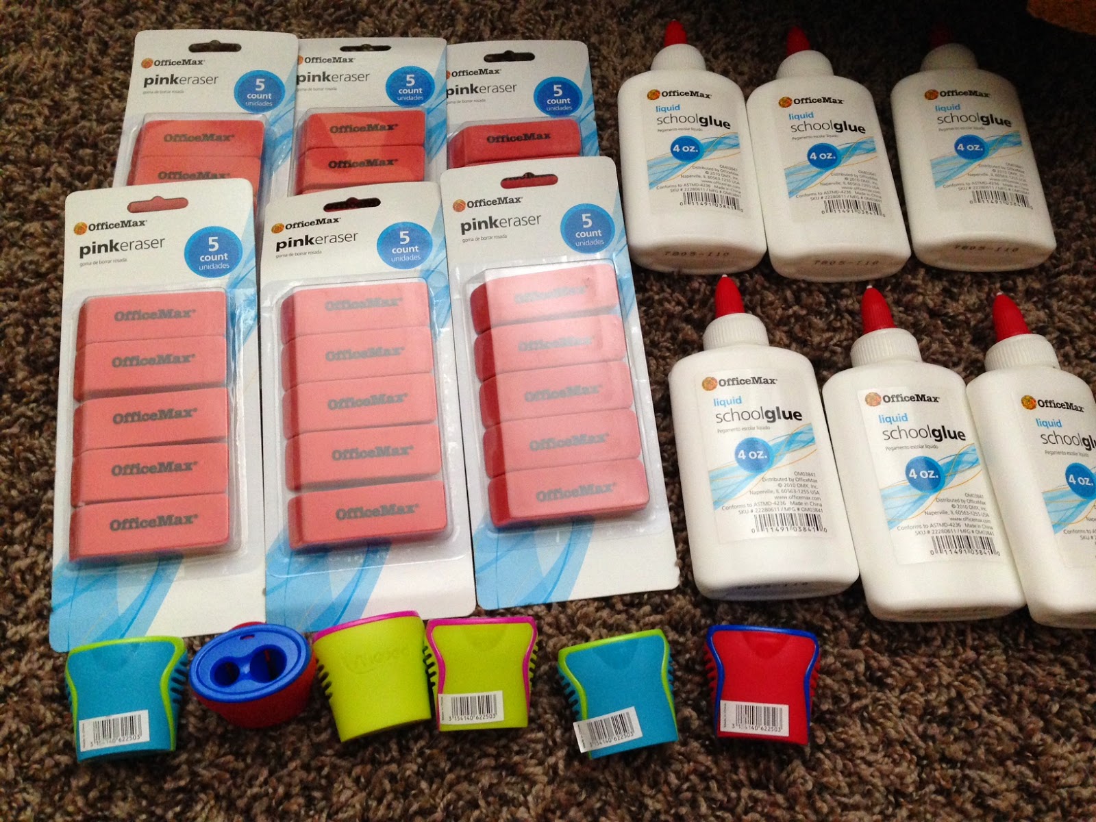 need! In the picture below is the result of one stop. I got enough erasers for the year, glue bottles and pencil sharpeners for all my boxes for $4.50. I saved $12.00 on supplies that I needed. Next week I'll be hitting the stores for the rulers, folders and pencils for pennies for sure!| One stop - cost me $4.50 |